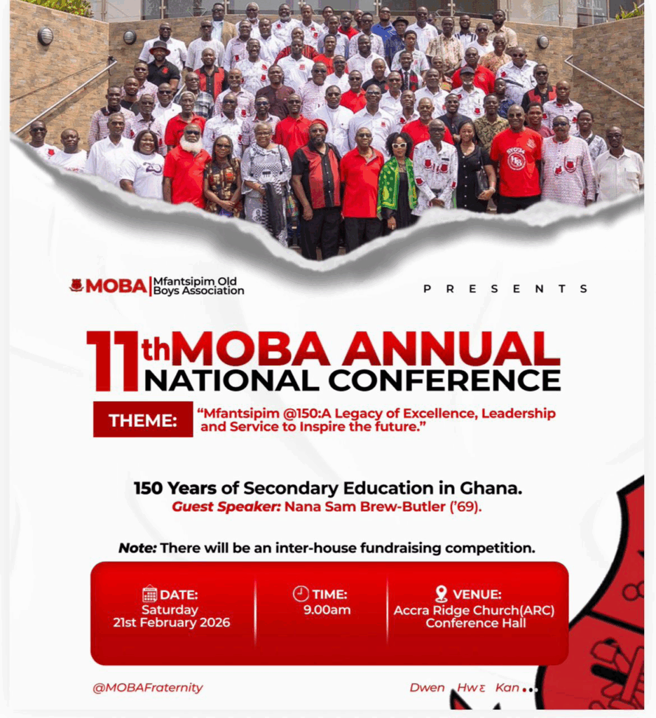 The Mfantsipim Old Boys Association (MOBA) will hold its 11th Annual National Conference. It will take place on Saturday, February 21, 2026. The conference will be held at the Accra Ridge Church Conference Room.